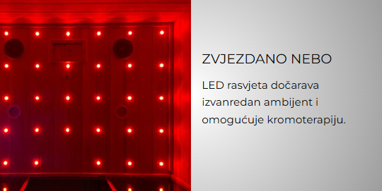 U sauni se možete pobrinuti za svoju psihičku ravnotežu kromoterapijom koju vam omogućuje RGB zvjezdano nebo. Medicinski je dokazano da korištenje saune ima iznimna ljekovita svojstva – od povećanja otpornosti, detoksikacije organizma, do poboljšanja cirkulacije i smanjenja bolova. Možete biti sigurni da će vam sauna donijeti zadovoljstvo i opuštanje nakon napornog dana.